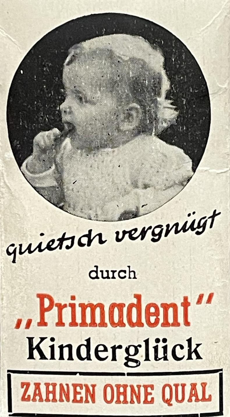 Le produit disponible à partir de 1950-1960 s'appelait Primadent, le bonheur des enfants. Comme le promet l'emballage, il enlève la douleur de la soi-disant "dentition". C'est le moment où les premières dents apparaissent chez les tout-petits. Cela le rendait plus supportable.